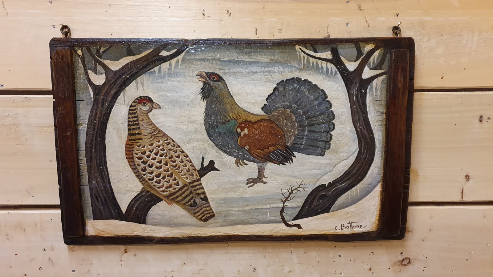 Pannello Gallo Cedrone. Quadro decorativo di legno di castagno realizzato e dipinto a mano con colori vegetali e resine naturali. Formato 73×46 cm