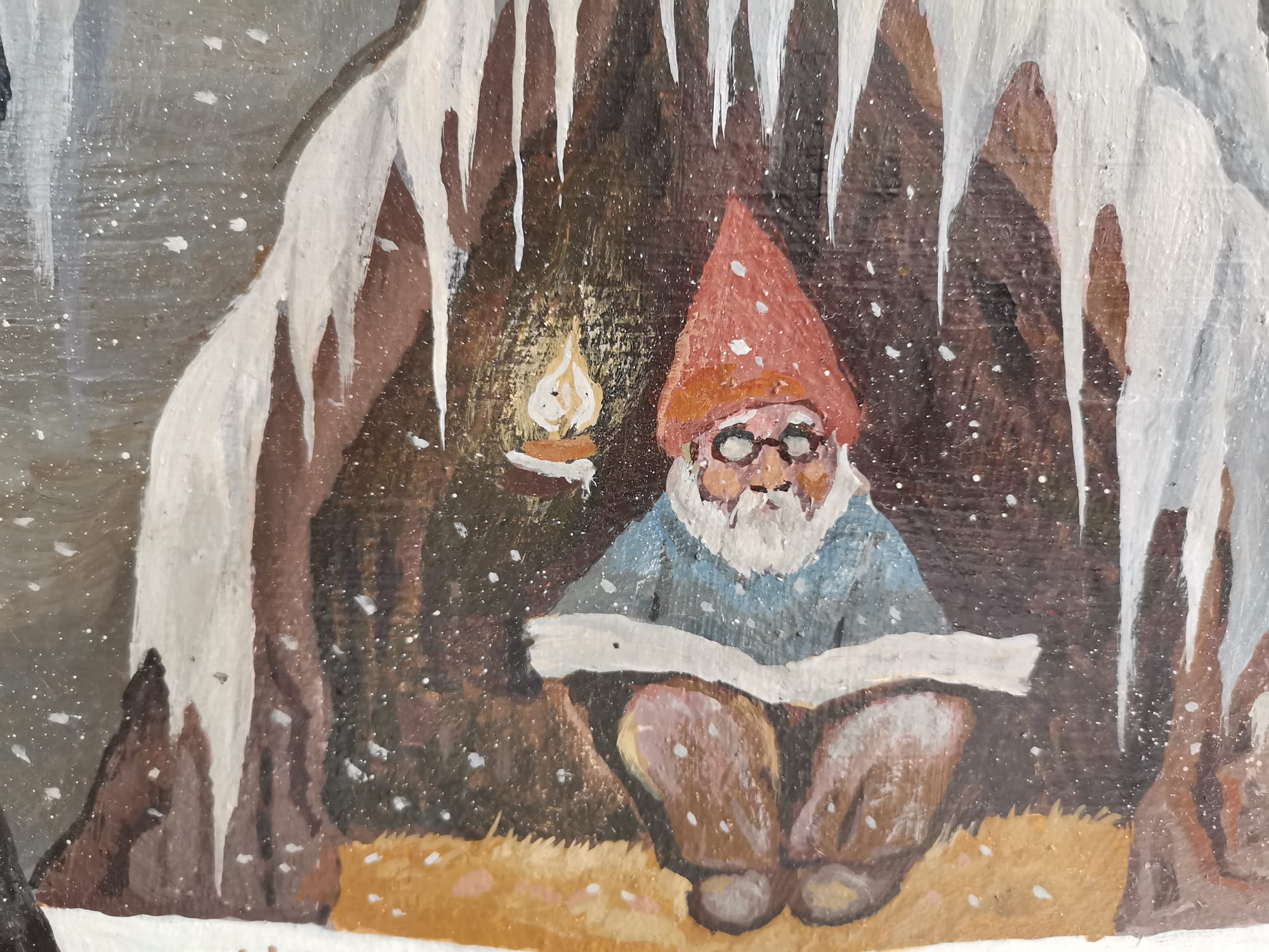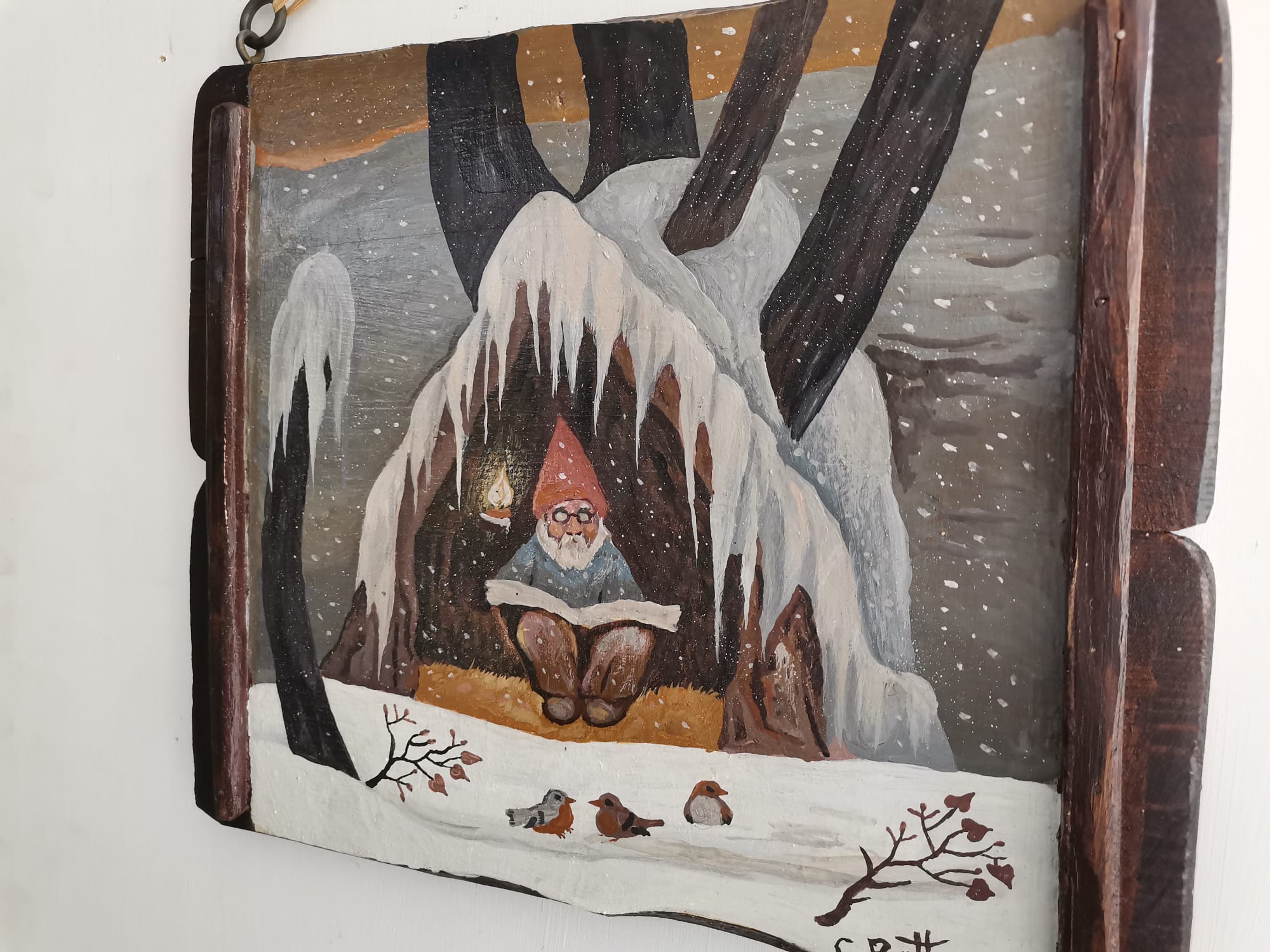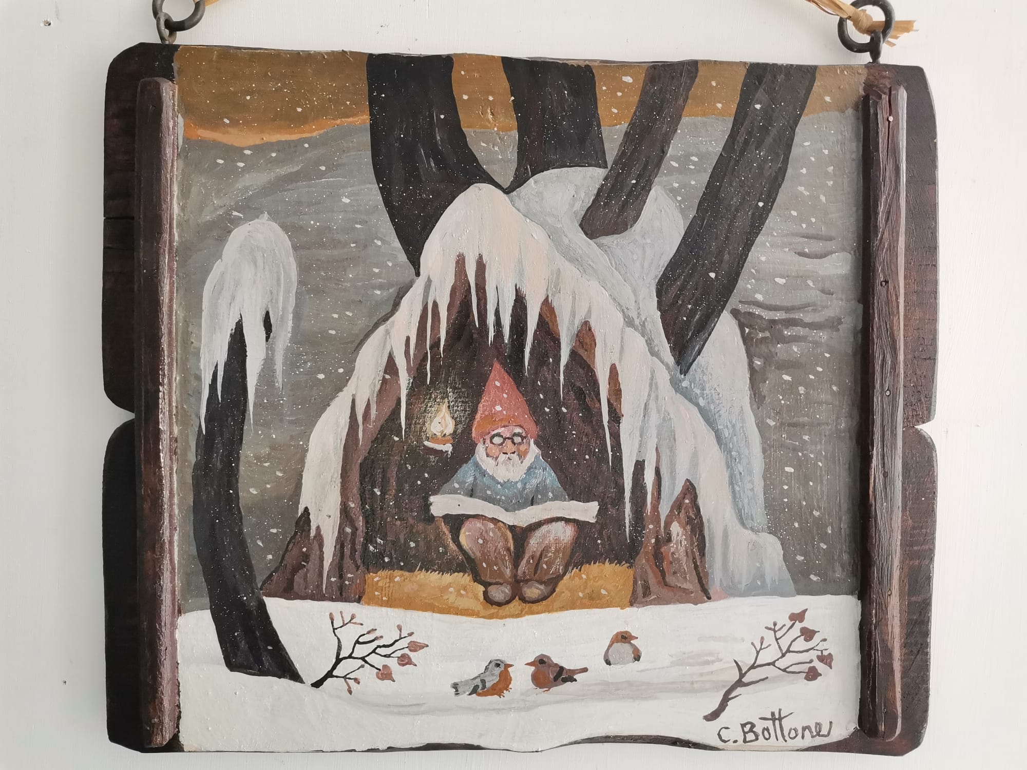 Pannello Gnometto che legge accanto al fuoco. Quadro decorativo di legni antichi restaurati. Realizzato e dipinto a mano con colori vegetali e resine naturali. Formato 36×30 cm